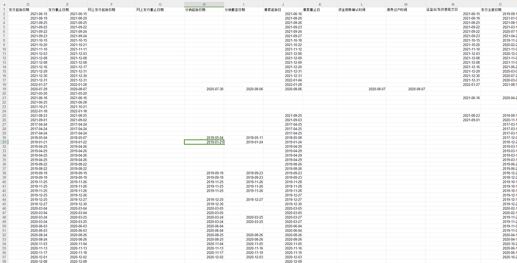 | 证券代码 | 证券简称 | 招投标日期 | 发行起始日期 | 发行截止日期 | 网上发行起始日期 | 网上发行截止日期 | 分销起始日期 | 分销截至日期 | 缴款起始日 | 缴款截止日 | 资金到账确认时间 | 债券过户时间 | 证监会/发改委批文日 | 发行注册日期 | 发行公告日 | 上市公告日 |