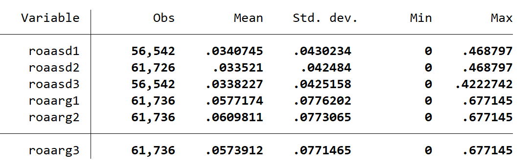 每种ROA计算方法下,分别测算(t0 t+1 t+2)、(t-1 t0 t+1)、(t-2 t-1 t0)的盈余波动性指标。