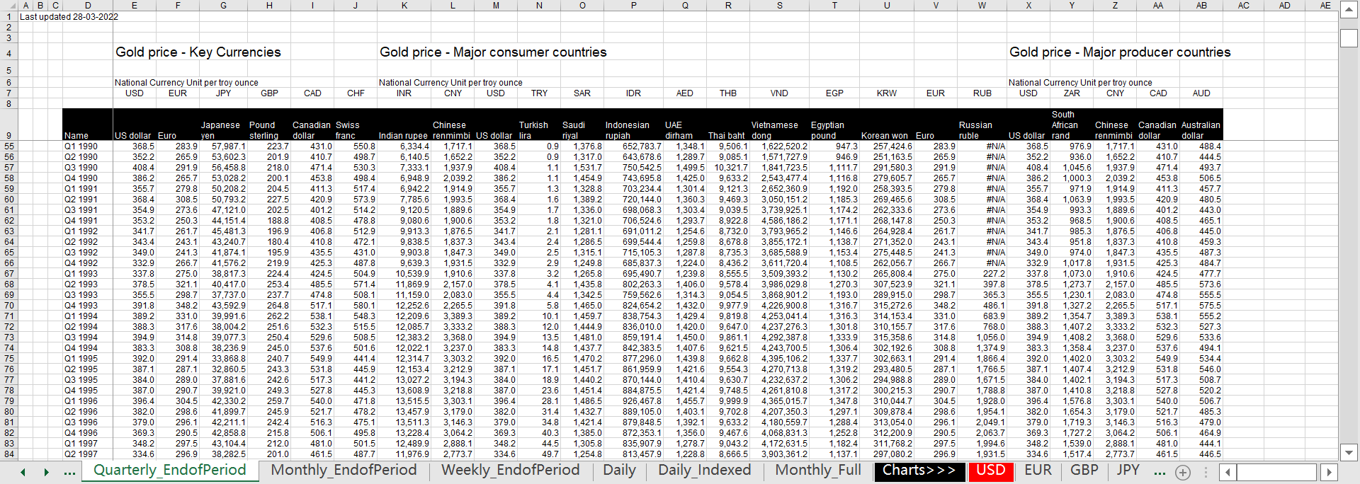 价格发现对于任何市场都是至关重要的。 黄金不仅有现货价格,还有LBMA黄金价格,以及几个地区的价格。 LBMA黄金价格是整个黄金市场的重要基准,而其他地区的黄金价格对当地市场也很重要。 该数据集提供了从1978年开始的一系列时间框架(每日、每周、每月、每年)内的黄金价格。