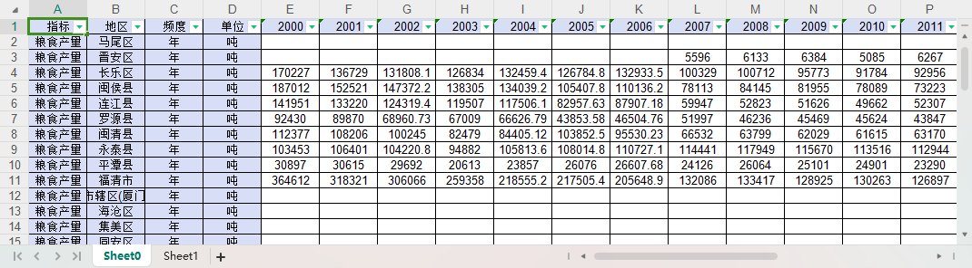 数据范围:各个省份的各个区县的粮食产量、肉类产量、油料产量、棉花产量