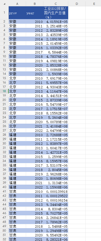 | prov | year | 工业SO2排放/国内生产总值(%) |