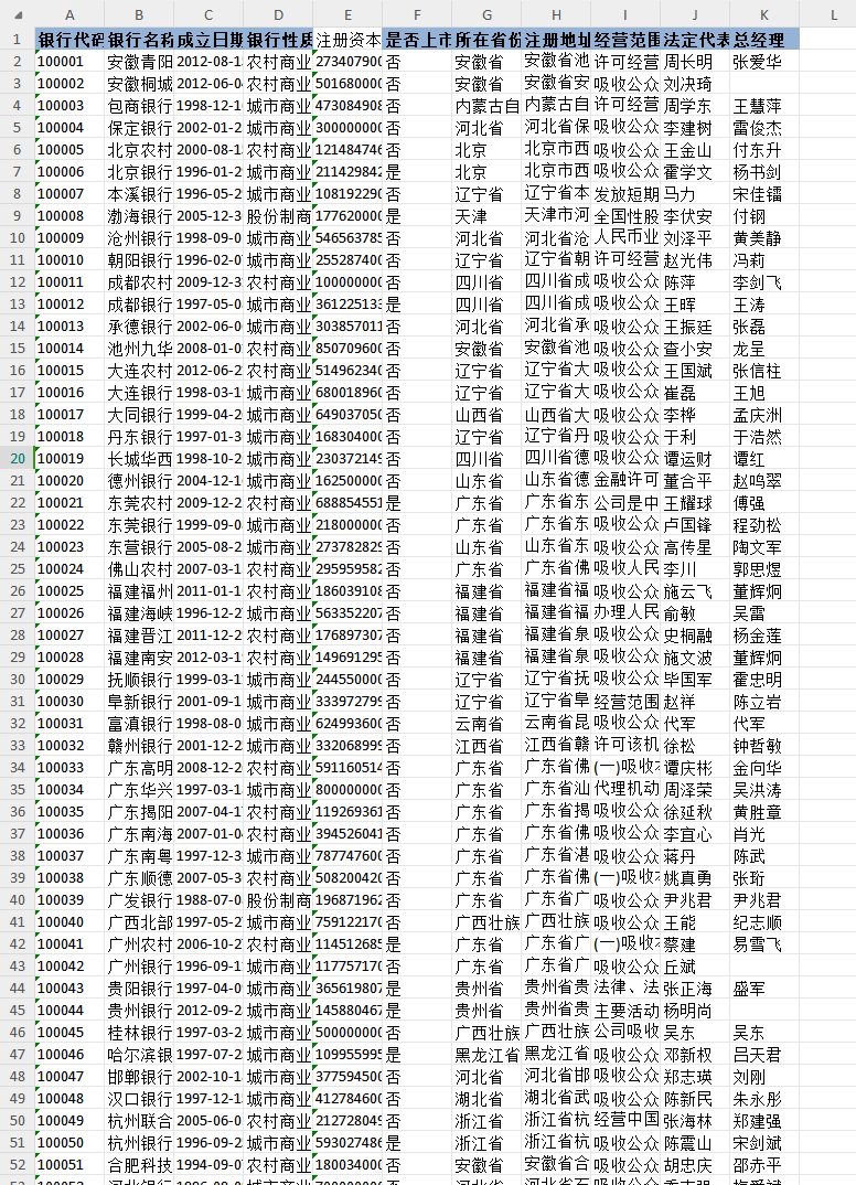 | 银行代码 | 银行名称 | 成立日期 | 银行性质 | 注册资本 | 是否上市 | 所在省份 | 注册地址 | 经营范围 | 法定代表人 | 总经理 |