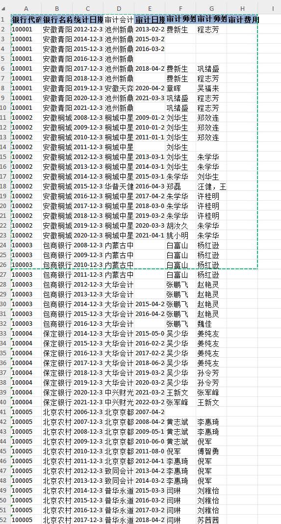 | 银行代码 | 银行名称 | 统计日期 | 审计会计师事务所 | 审计日期 | 审计师姓名1 | 审计师姓名2 | 审计费用 |