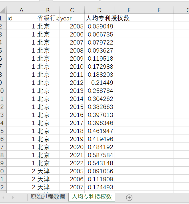 全国31个省份人均专利授权数2005-2022年(创新产出)
