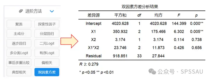 举例:SPSSAU双因素方差分析结果如下: