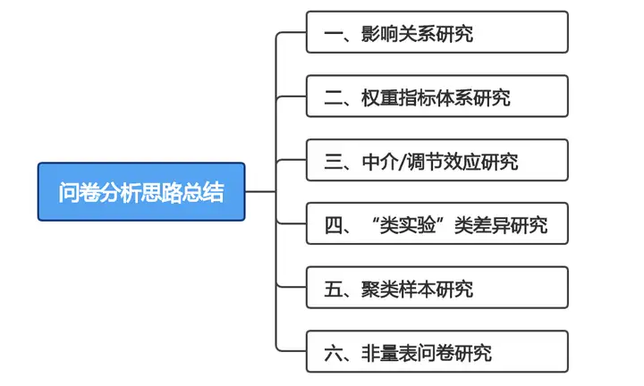 非量表类问卷的研究思路可以分成7个部分,分别是样本背景分析,样本特征、行为分析,基本现状分析,样本态度分析,差异分析,影响关系分析和其他,在具体分析时可以结合实际情况进行选择。比如如果问卷中包含部分量表题项,那么非量表类问卷研究可能还会涉及探索性因子分析、信度分析、方差分析等。
