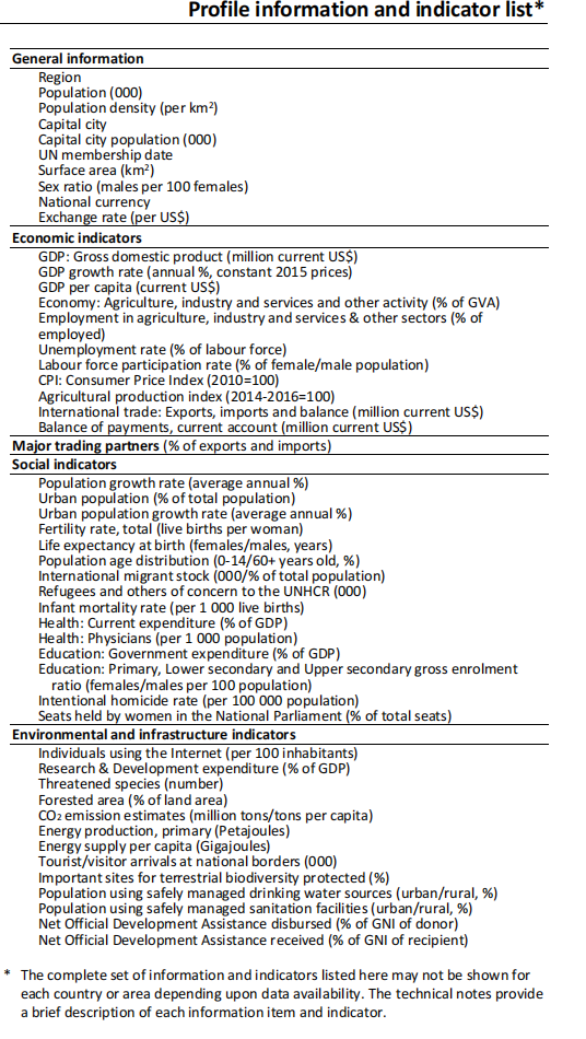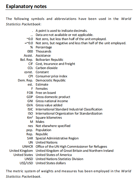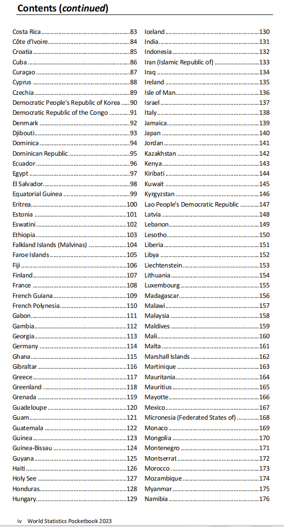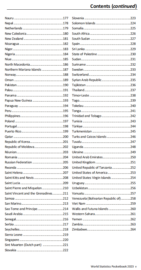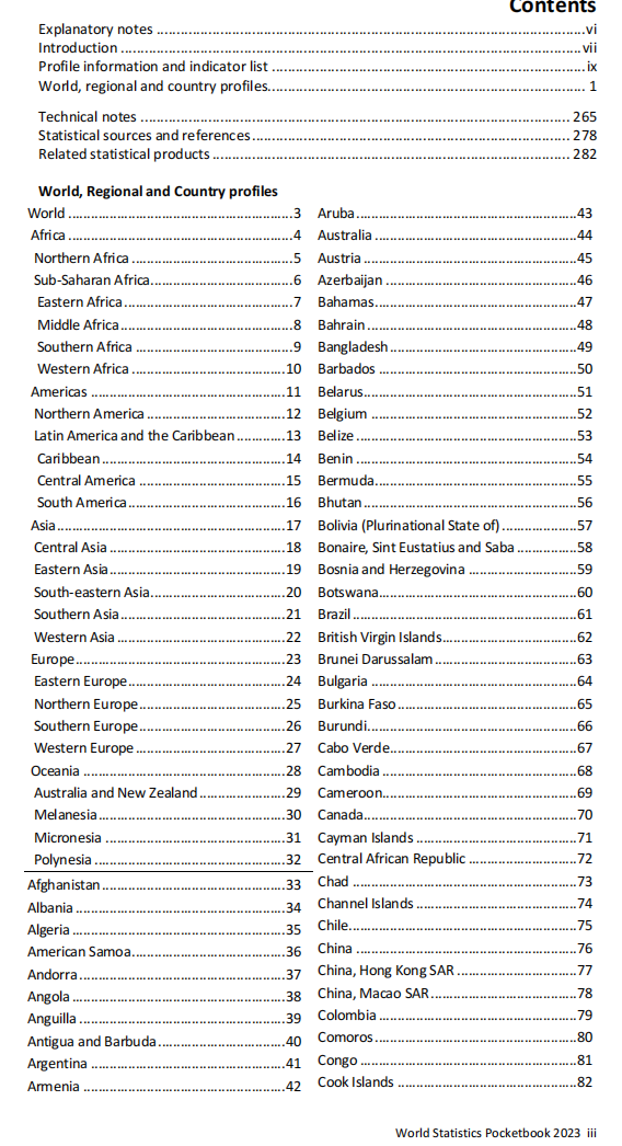 The World Statistics Pocketbook, 2023 edition is the forty-seventh in a series of annual compilations of key statistical indicators prepared by the United Nations Statistics Division of the Department of Economic and Social Affairs. Over 50 indicators have been collected from more than 20 international statistical sources and are presented in one-page profiles for 30 world geographical regions and 232 countries or areas. The Pocketbook is organized into 5 sections; general information, economic indicators, major trading partners, social indicators, and environmental and infrastructure indicators. This issue presents data for the economic, social, environmental and infrastructure sections for three reference years - 2010, 2015 and 2023 - when available or the most recent data previous to these years, back to 2005, when it is not. For the general information and major trading partners sections the reference year is 2023 and 2022 respectively, unless otherwise footnoted. The indicators in the profiles cover the following topics: communication, crime, development assistance, education, energy, environment, finance, gender, health, international tourism, international trade, labor market, national accounts, population and migration, price and production indices and science and technology.