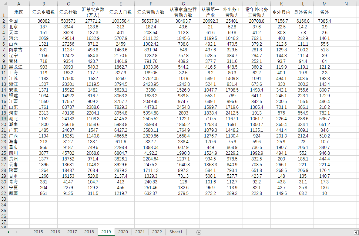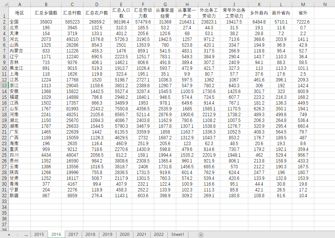 2006-2022各省省内省外劳动力转移、家庭经营、外出务工劳动力数据,excel版本
