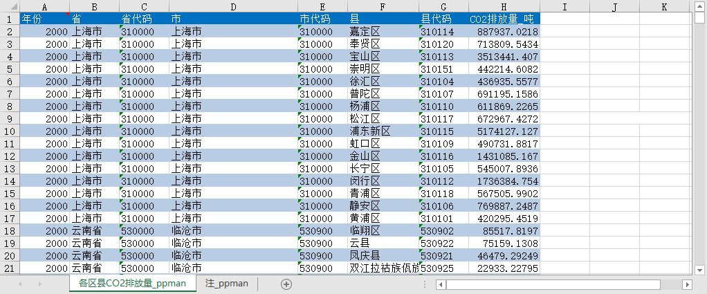 来自全球大气研究排放数据库--EDGAR(Emissions Database for Global Atmospheric Research),原始数据为txt格点数据,通过arcgis处理,分区域汇总提取得到2000-2021年中国各区县 CO2 排放量面板数据。