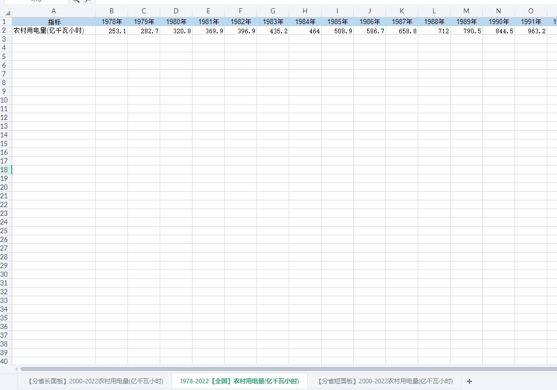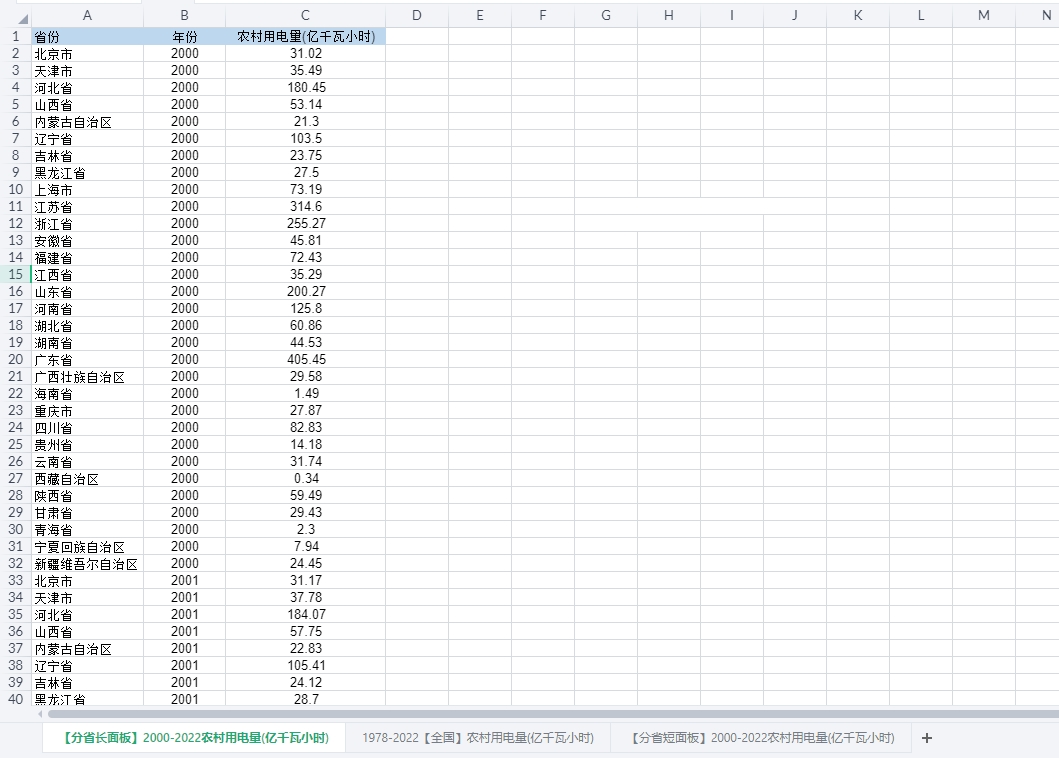 相关数据及指标:省份、年份、农村用电量(亿千瓦小时)。