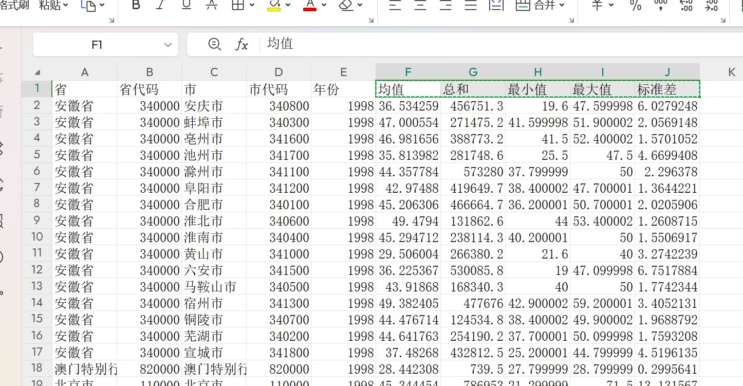 共计12个指标:省、省代码、市、市代码、县代码、县、年份、均值、总和、最小值、最大值、标准差