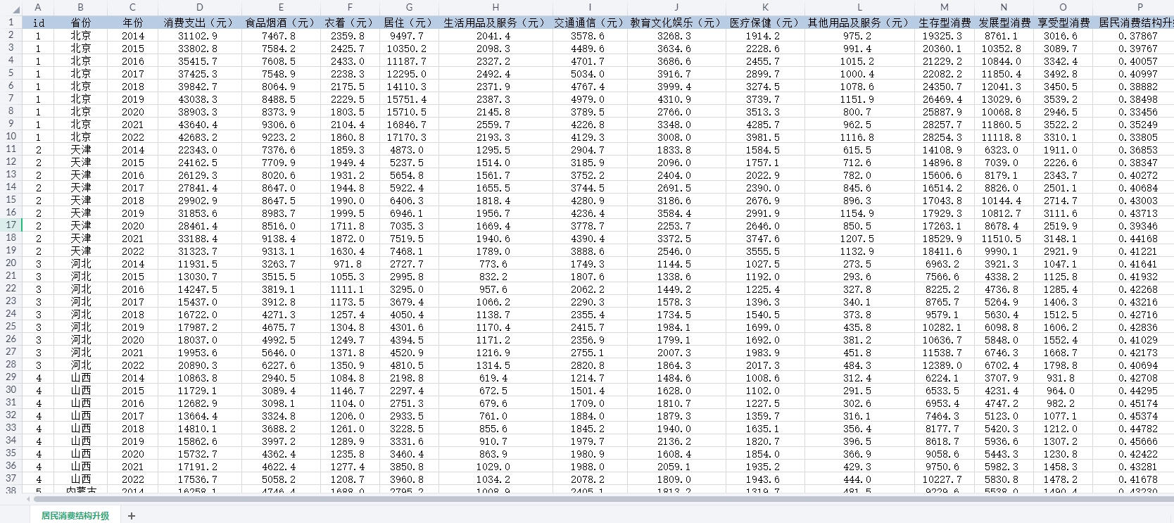 id、省份、年份、消费支出(元)、食品烟酒(元)、衣着(元)、居住(元)、生活用品及服务(元)、交通通信(元)、教育文化娱乐(元)、医疗保健(元)、其他用品及服务(元)、生存型消费、发展型消费、享受型消费、居民消费结构升级。