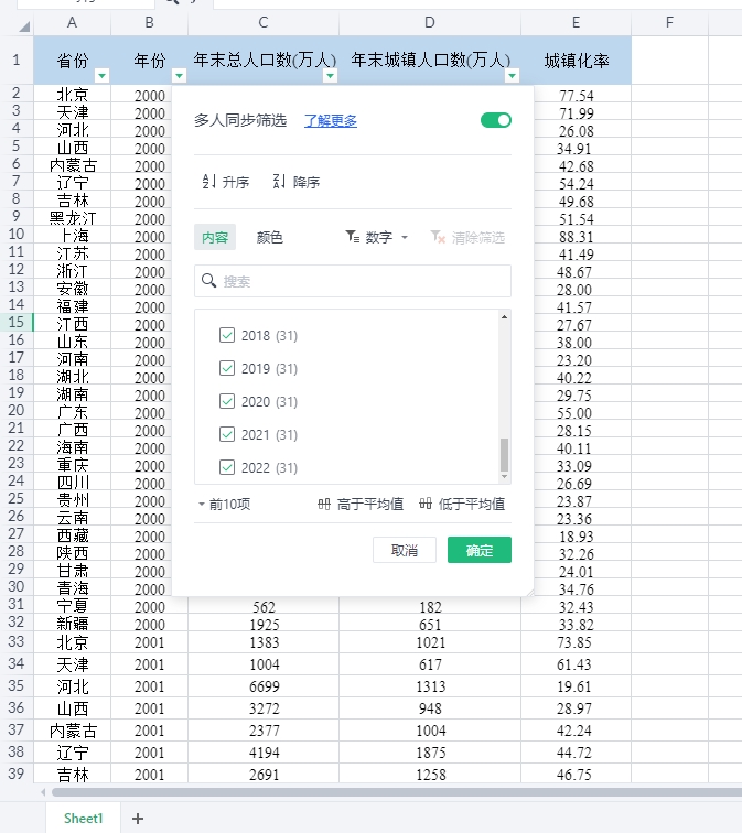 省份、年份、年末总人口数(万人)、年末城镇人口数(万人)、城镇化率