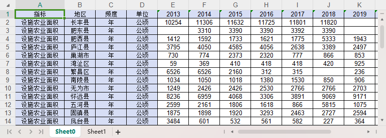 数据样式如上图所示(以安徽省的区县为例,其他各省的区县类似)。