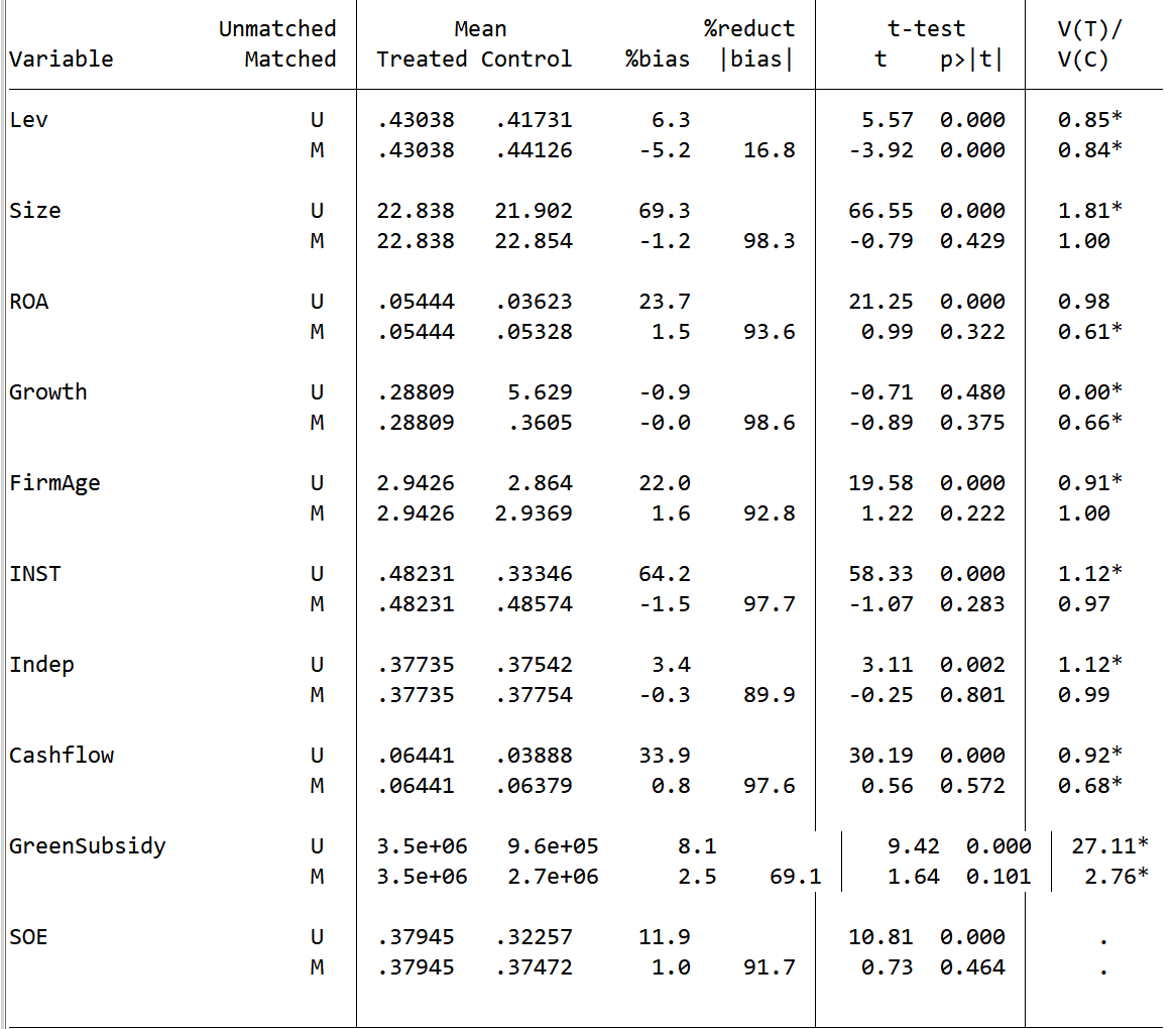 lev是企业资产负债率,我的协变量都是我前面做回归用到的控制变量,我感觉lev作为控制变量是不是挺重要的就不太想去掉,我目前不太清楚大部分文献是必须要求平衡性检验t值不显著吗?因为看到有只写bias检验的