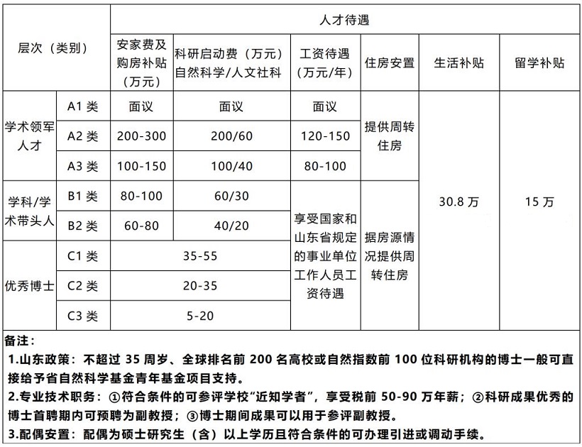 根据岗位设置,引进对象分为学术领军人才(A1,A2,A3)、学科/学术带头人(B1,B2)和优秀博士(C1,C2,C3)三个层次。