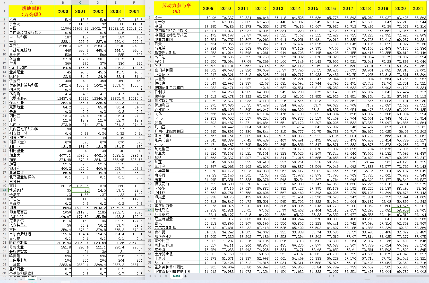 2000-2021年 全球 200多个国家 人均耕地面积 劳动力参与率 税收占GDP 土地面积 人口密度 研发支出占GDP
