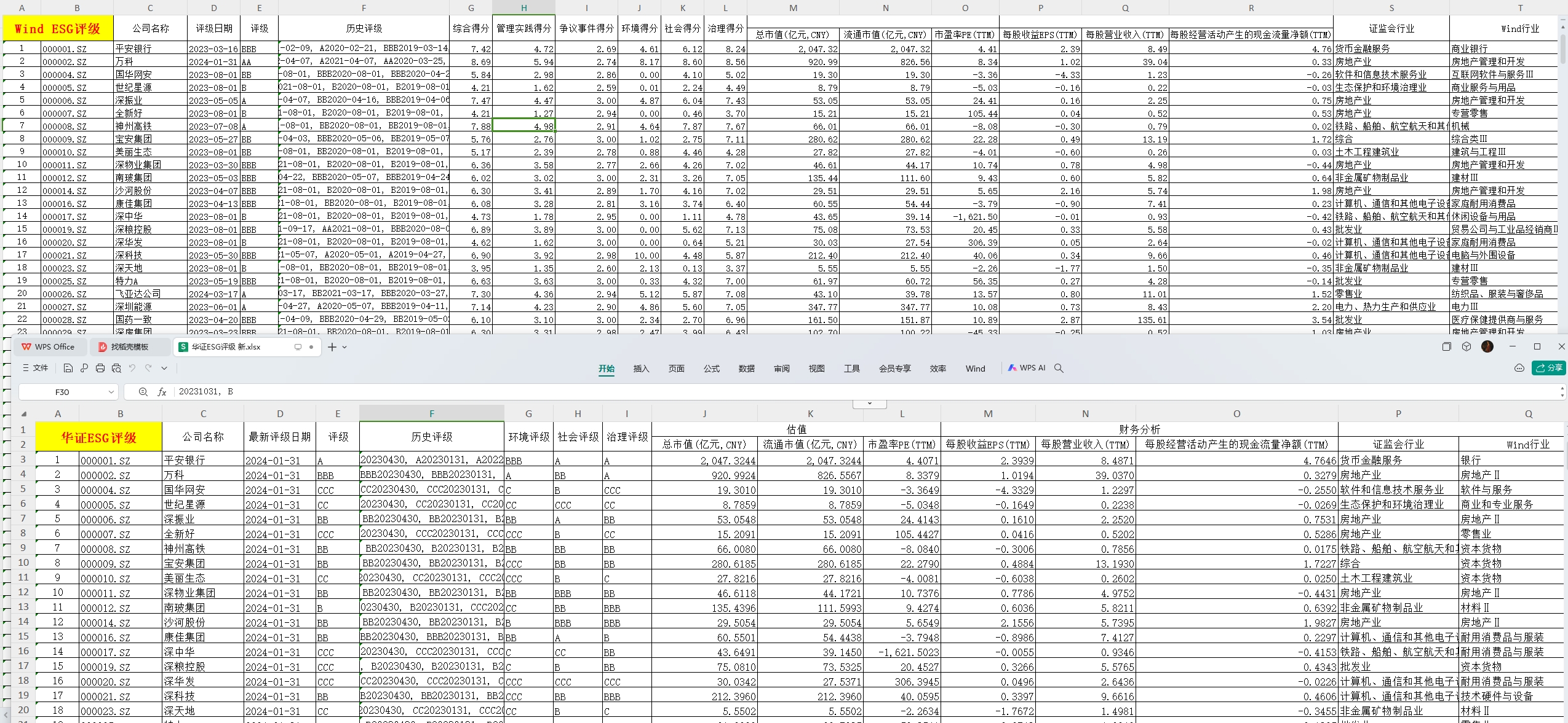 2024年4月初 上市公司 华证ESG评级 Wind ESG评级 商道融绿ESG评级 富时罗素ESG评级 数据
