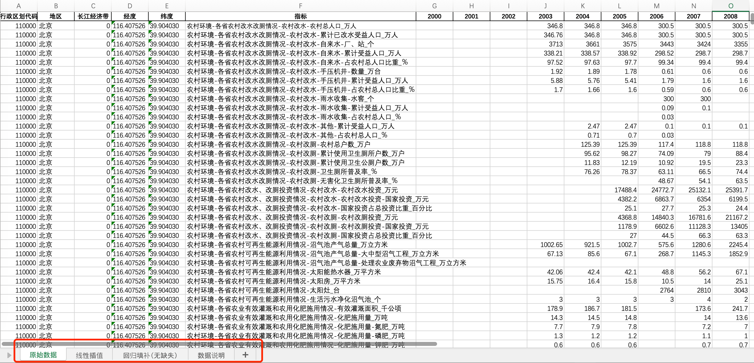 数据格式:Excel面板数据含原始数据(由于多年度指标不同存在缺失值)、线性插值、回归填补(无缺失)三个版本,提供您参考使用。其中,回归填补无缺失值。