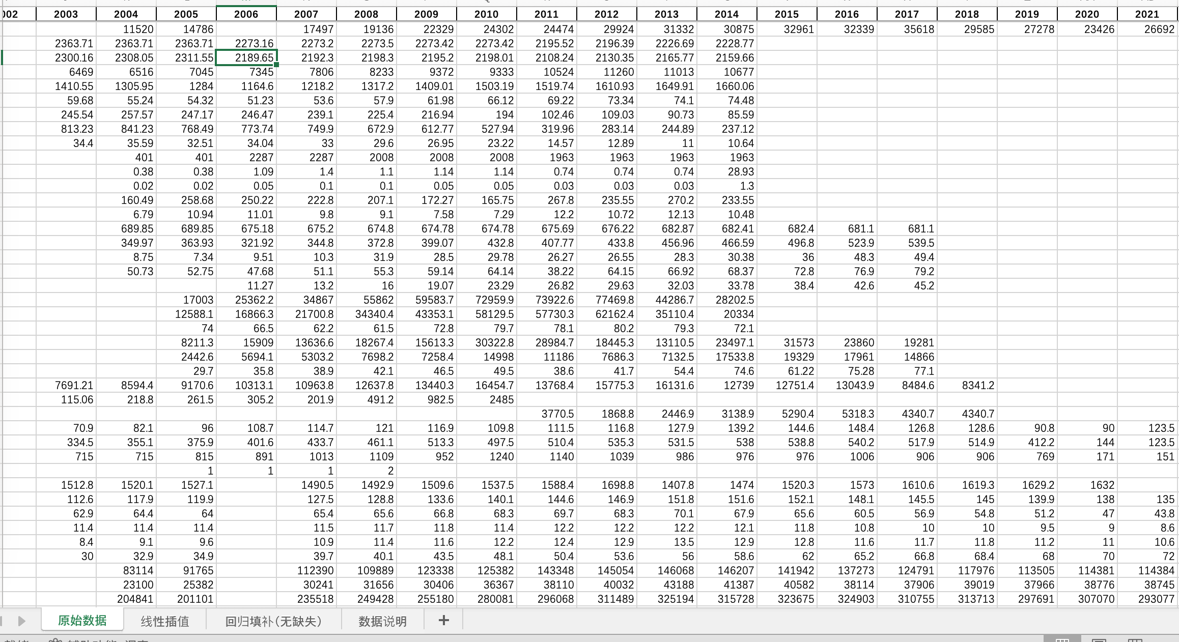 注意:我们把横跨22年不同的指标数据都罗列出来了,而每年年鉴口径客观变化情况,原始数据中存在披露口径缺失,其余非数据缺失,而是该年鉴口径没有统计。故提供线性插值及回归填补无缺失版本。
