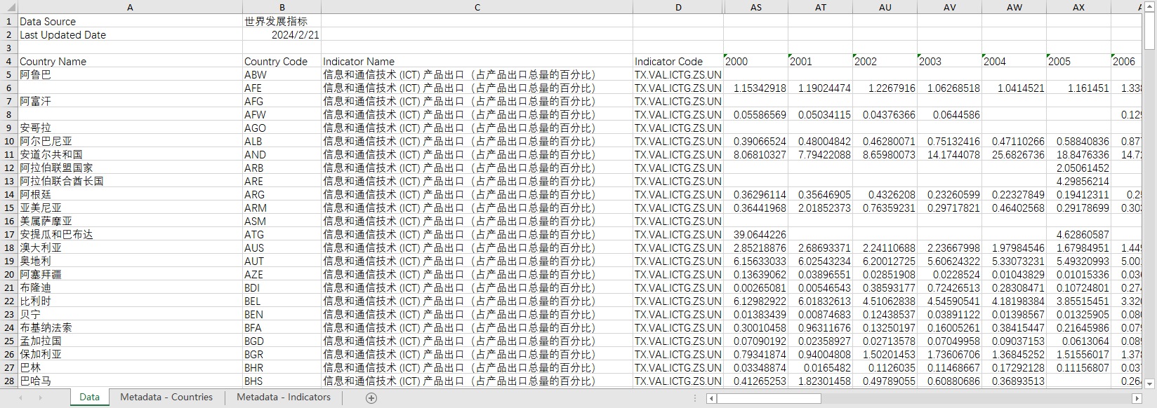 全球世界各国经济发展数据2000-2022信息和通信技术 (ICT) 产品出口(占产品出口总量的.xls