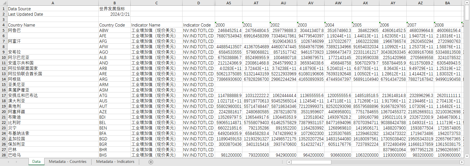 yusb 发表于 2024-4-3 21:58 全球世界各国经济发展数据2000-2022工业增加值(现价美元) 数据来源:WDI世界银行