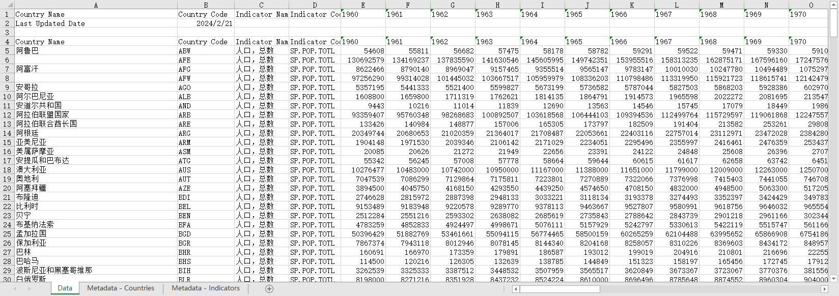 全球世界各国经济发展数据1960-2022人口总数.xls