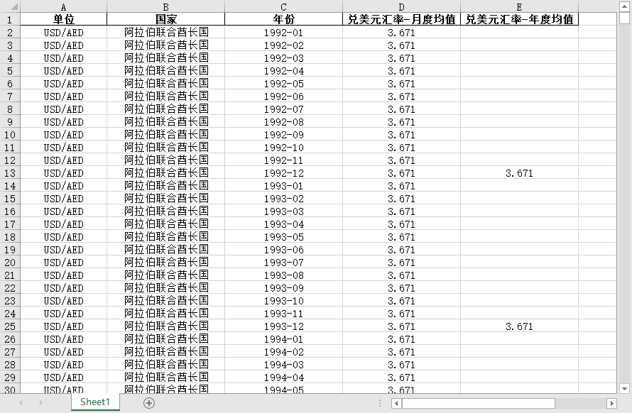全球世界各国地区货币兑美元汇率期内平均、期末1991-2024月度、年度数据