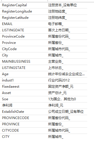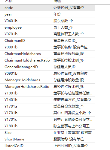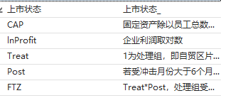共计23个指标:code、year、employee、Size、ShortName、IndustryName、IndustryCode、ProvinceCode、Province、CityCode、City、Age、indust1、Fixedaeest、Asset、Soe、Profit、CAP、lnProfit、上市状态、Treat、Post、FTZ