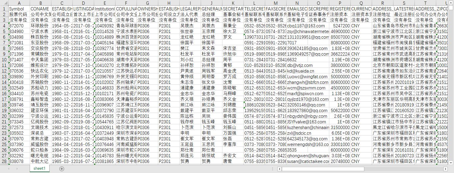 股票代码 公司中文简称 公司成立日期 首次上市日期 上市公司ID 公司中文全称 上市公司经营性质编码 公司设立方式编码 法人代表 总经理 董事会秘书 董秘联系电话 董秘联系传真 董秘电子信箱 证券事务代表人 注册资本 注册资本货币编码 注册地址 最近注册日期 公司办公地址 办公地邮政编码 营业执照注册号 税务登记号码 公司网址 电子邮箱 指定信息披露报刊 指定信息披露网站 年报备置地 所属城市代码 所属城市 所属省份代码 所属省份 国家区域3位英文代码 公司所属国家区域 主营业务 公司经营范围 公司历史沿革 股份公司设立日期 统一社会信用代码