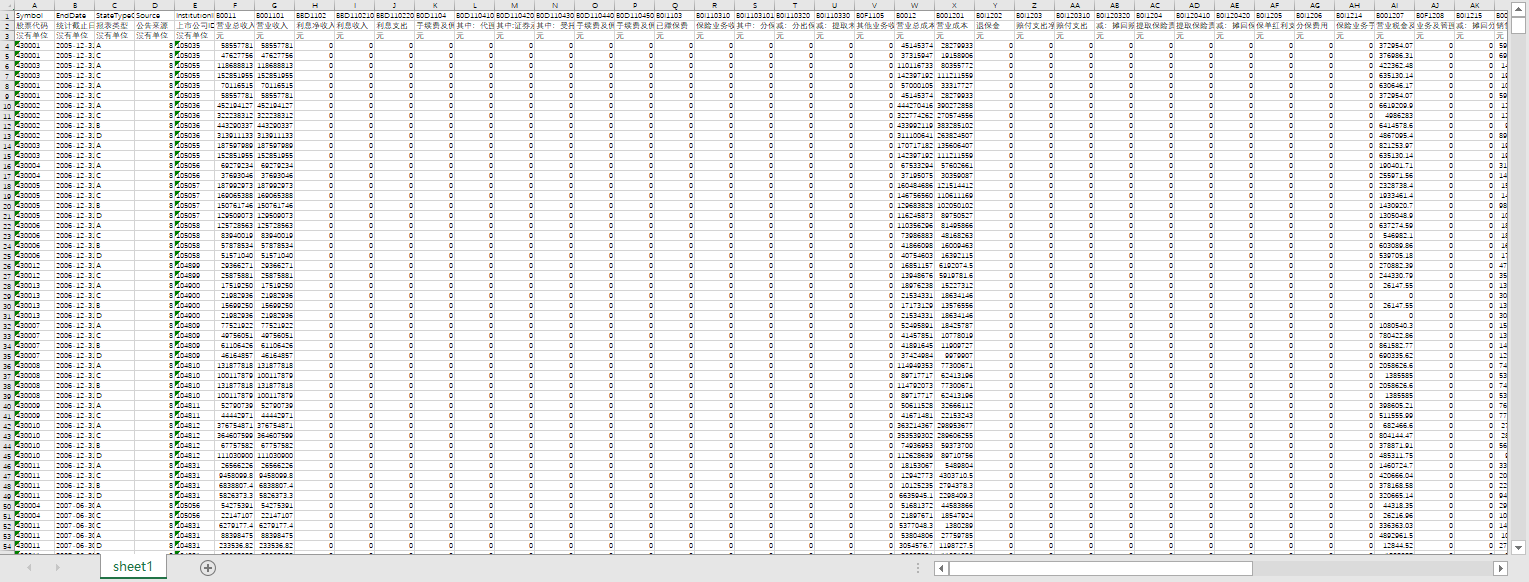 股票代码 统计截止日期 报表类型 公告来源 上市公司ID 营业总收入 营业收入 利息净收入 利息收入 利息支出 手续费及佣金净收入 其中:代理买卖证券业务净收入 其中:证券承销业务净收入 其中:受托客户资产管理业务净收入 手续费及佣金收入 手续费及佣金支出 已赚保费 保险业务收入 其中:分保费收入 减:分出保费 减:提取未到期责任准备金 其他业务收入 营业总成本 营业成本 退保金 赔付支出净额 赔付支出 减:摊回赔付支出 提取保险责任准备金净额 提取保险责任准备金 减:摊回保险责任准备金 保单红利支出 分保费用 保险业务手续费及佣金支出 营业税金及附加 业务及管理费 减:摊回分保费用 销售费用 管理费用 财务费用 资产减值损失 其他业务成本 投资收益 其中:对联营企业和合营企业的投资收益 公允价值变动收益 汇兑收益 其他业务利润 营业利润 营业外收入 其中:非流动资产处置利得 营业外支出 其中:非流动资产处置净损益 其中:非流动资产处置损失 利润总额 所得税费用 未确认的投资损失 影响净利润的其他项目 净利润 归属于母公司所有者的净利润 少数股东损益 基本每股收益 稀释每股收益 其他综合收益(损失) 综合收益总额 归属于母公司所有者的综合收益 归属少数股东的综合收益