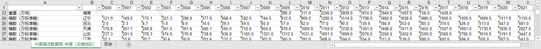 辽宁河北天津山东江苏上海浙江广东广西海南海洋货运集装箱数运量重量货物旅客吞吐量2000-2021