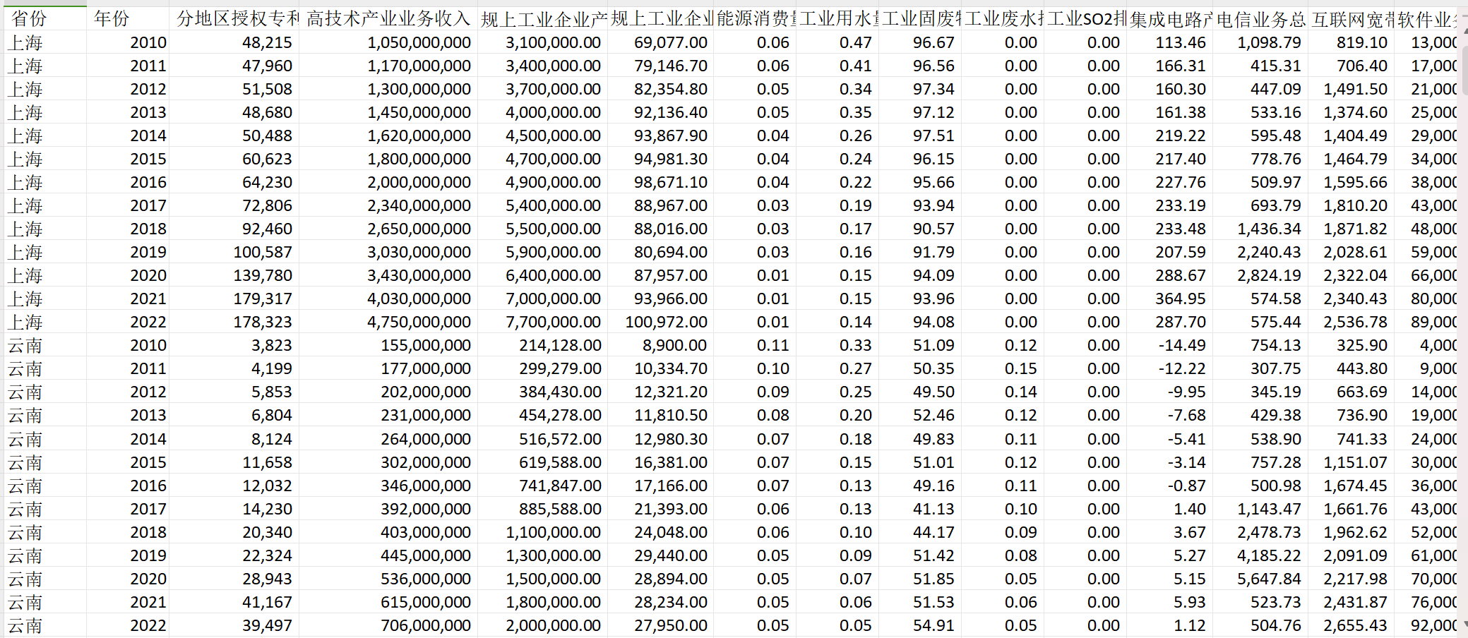 指标说明:省份、年份、分地区授权专利数、高技术产业业务收入、规上工业企业产业创新经费、规上工业企业R&D人员全时当量、能源消费量/国内生产总值、工业用水量/国内生产总值、工业固废物综合利用量/产生量、工业废水排放/国内生产总值、工业SO2排放/国内生产总值、集成电路产量、电信业务总量、互联网宽带接入端口数、软件业务收入、光缆线路长度/地区面积、电子商务销售额、新质生产力