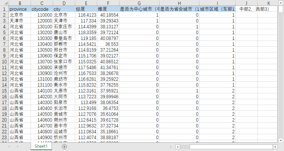 provcode province citycode city 经度 维度 是否为中心城市(中心城市:地级市和副省级城市,1是中心城市) 是否为省会城市(1是省会城市) 城市区域(东部1,中部2,西部3)