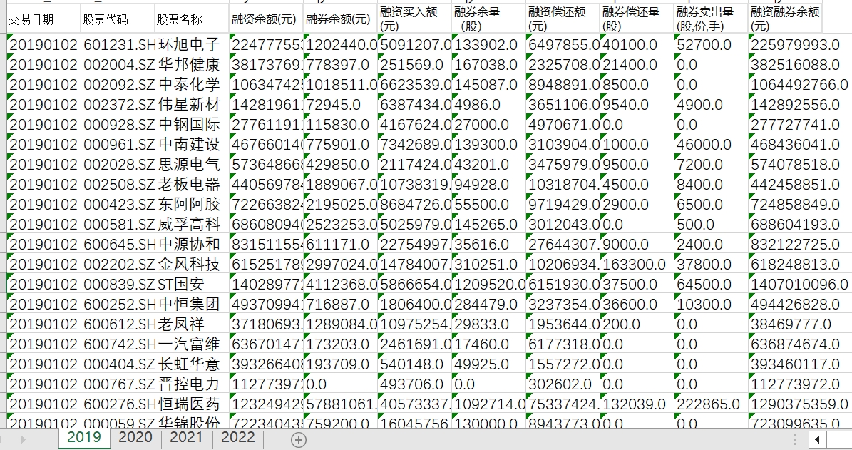 A股每日融资融券明细数据2019-2022