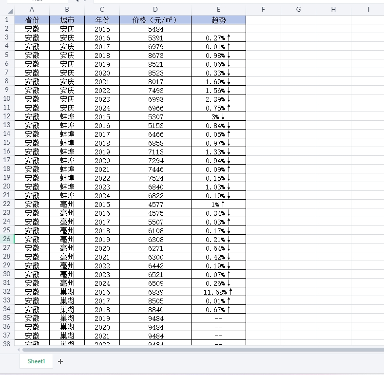 省份、城市、年份、价格(元/㎡)、趋势。