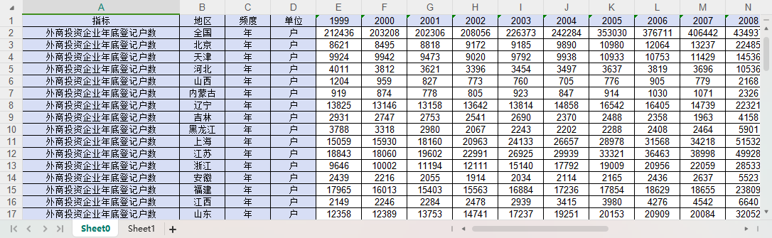 全国31个省份外商投资企业年底登记户数投资总额注册资本1999-2022