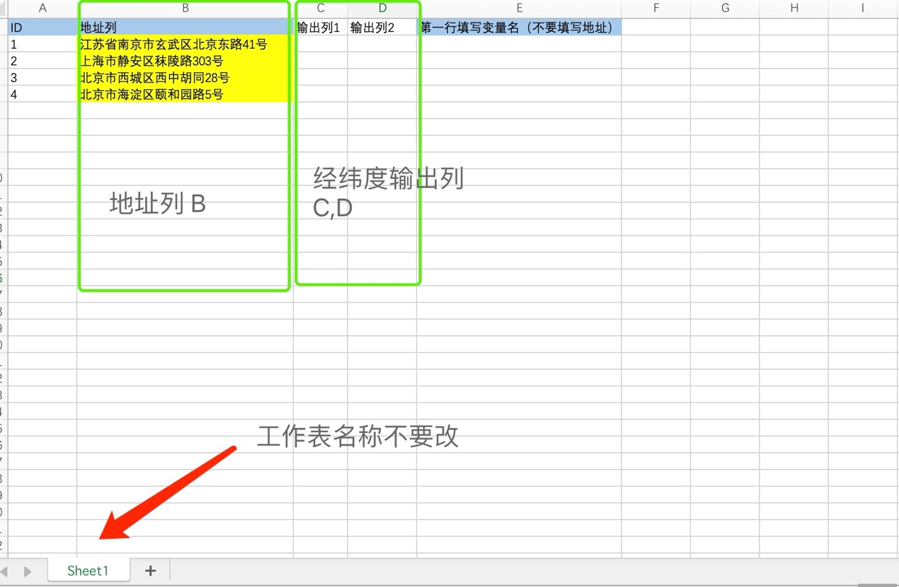 首先,将要需要转化的地址按照附件中Excel模板整理好后保存: