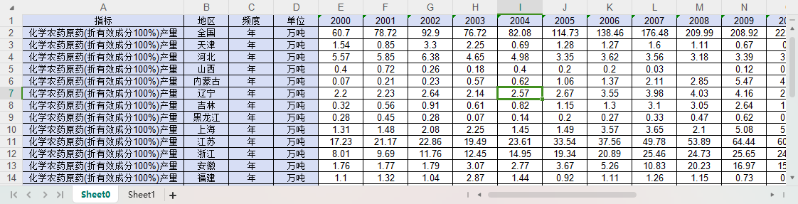 全国31个省份化学农药原药(折有效成分100%)产量2000-2023.xlsx