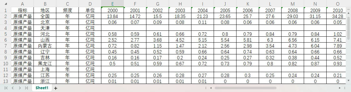 全国31个省份原煤产量2000-2023.xlsx
