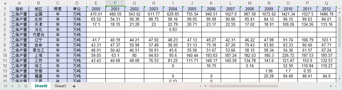 全国31个省份乙烯产量2000-2023.xlsx
