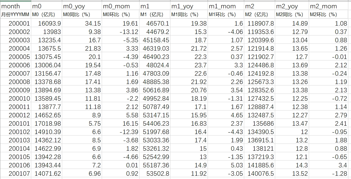 【2000-2021】全国 货币供应量M0、M1、M2 月度数据