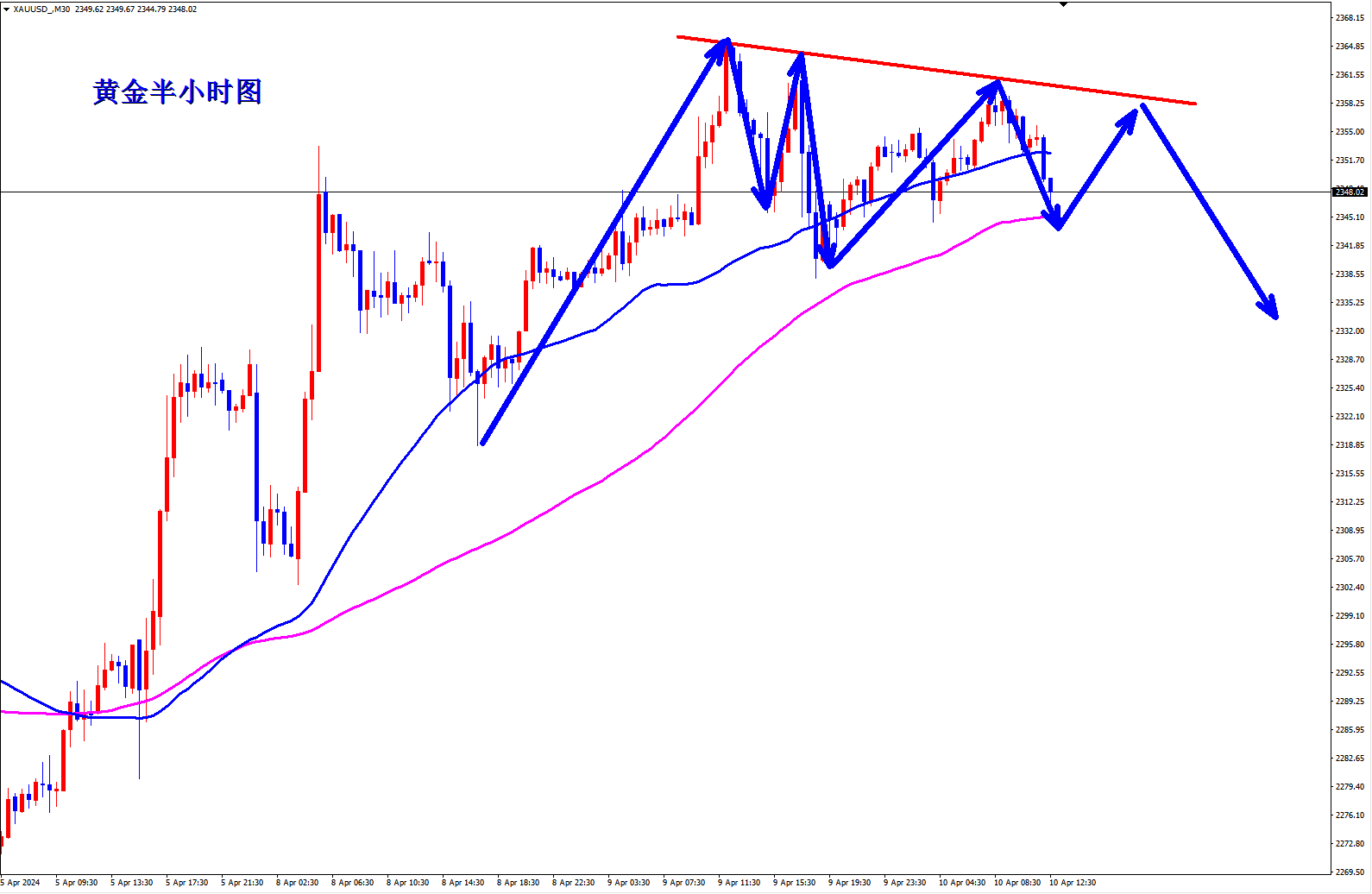 黄金30分钟均线开始拐头,上涨力度开始不足了,这两天黄金开始不是单边强势,已经开始不在屡创新高,而是两次反弹上涨都不再创新高,黄金反弹高点依次降低,反弹不破新高还是继续空,现在CPI波动比较大,美盘反弹2362附近继续空,如果数据利多直接创新高,那么我们就再重新调整方向,没有破新高前继续看空。