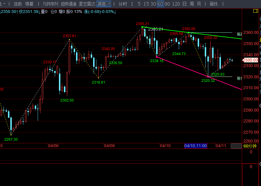今日的短线思路,还是以高空看跌为主,在价格破高之前,一小时构筑新的底部之前,空,将是主要思路!但需要注意的是,昨夜价格多次触及2325后快速反抽,这里是前期起涨低点,因此买盘较强。黄金30分钟均线已经进入死叉向下排列,黄金均线阻力2343,今日受2343阻力下都是逢高给干空的机会,黄金短线2341附近可以先空起来。综合来看,今日黄金短线操作思路上指南金师建议反弹做空为主,回调做多为辅,上方短期重点关注2343-2345一线阻力,下方短期重点关注2300-2303一线支撑,各位朋友一定要跟上节奏。要控制好仓位及止损问题、严格设止损,切勿抗单操作。近期市场动荡幅度较大,机会与风险并存,控制风险再博收益。