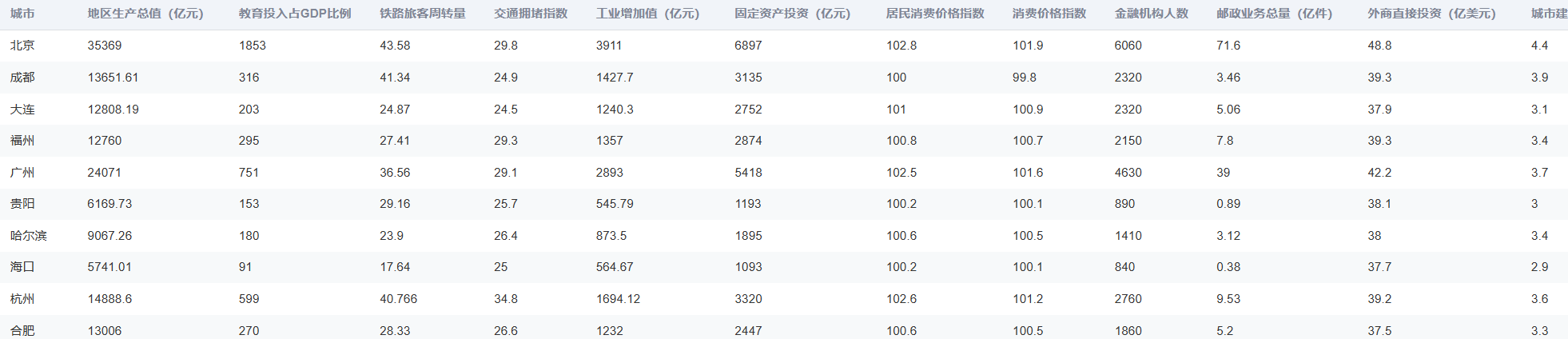 这份数据集包含了中国主要城市的多项指标数据,涵盖了经济、人口、交通等多个方面。这些指标反映了各城市在经济发展、人口规模、交通状况和环境保护等方面的情况,可以用于城市间的比较分析和发展评估。