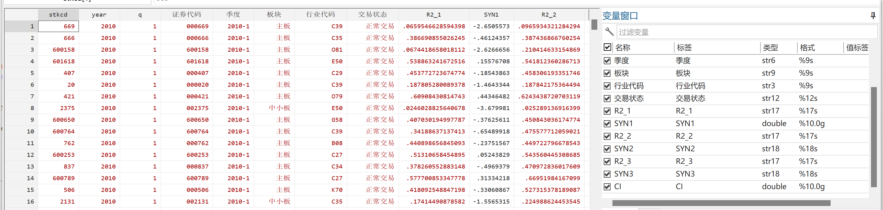 在t季度的被解释变量(SYN1)需要本年度t-1季度的解释变量(CI),这个在stata中如何实现啊,球球大佬的代码帮助!附上我的数据部分图