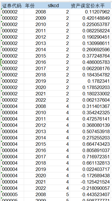 证券代码、年份、stkcd、资产误定价水平。