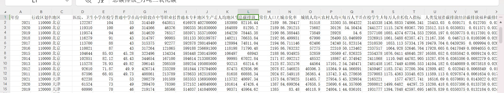 二、指标说明共计24个指标:年份、行政区划代码、地区、医院、卫生院床位数(张)、小学在校学生数(万人)、普通中学在校学生数(万人)、高中阶段在校学生数(人)、中等职业技术学校在校学生数(人)、普通本专科在校学生数(人)、地区生产总值(万元)、人均地区生产总值(元)、总碳排放_万吨二氧化碳、常住人口万人、城市化率、城镇人均可支配收入、农村人均可支配收入、每万人平均医疗床位数、在校学生人数人)、每万人在校生数、收入指标、人类发展指数、碳排放经济效益、碳排放福利绩效、碳排绩效