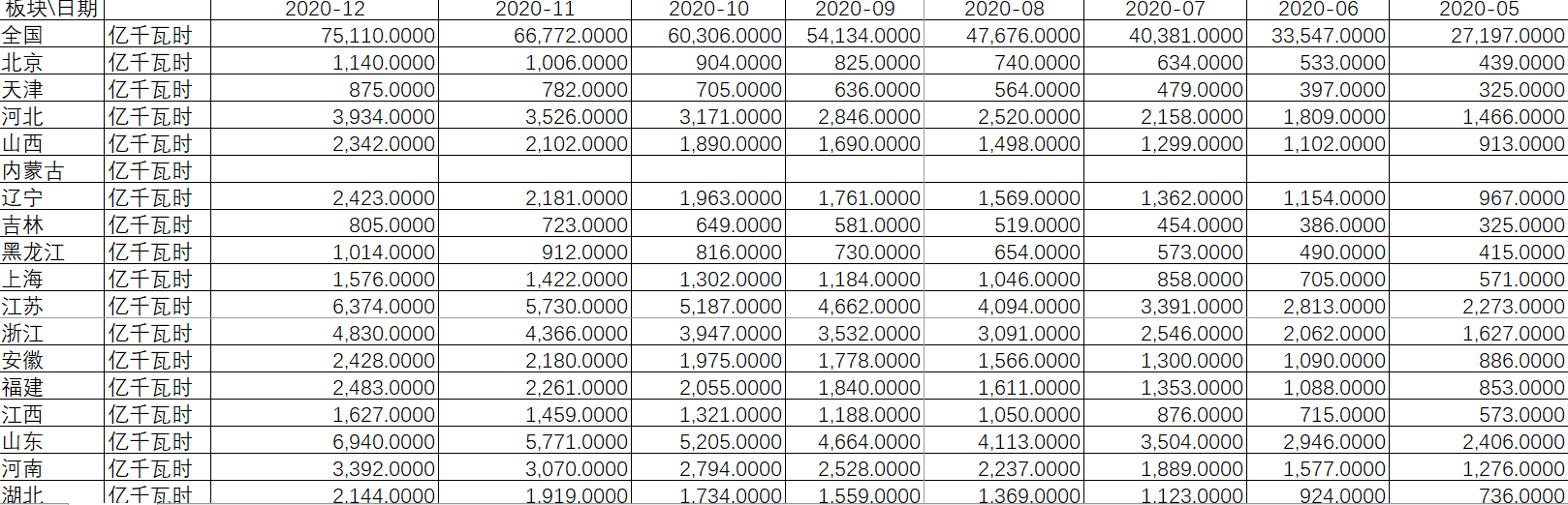 分省份发电量/用电量累计值(月)1990-2020年