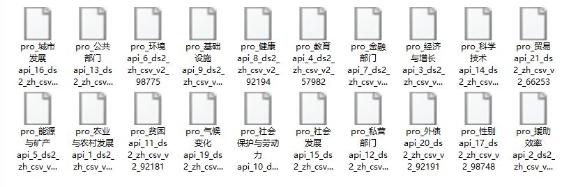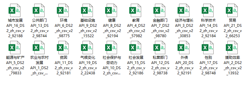 5.一共20个方面的指标,包括健康、公共部门、农业与农村发展、城市发展、基础设施、外债、性别、援助效率、教育、气候变化、环境、社会保护与劳动力、社会发展、私营部门、科学技术、经济与增长、能源与矿产、贫困、贸易、金融部门,详情请参考世界银行原网站或附件Indicators_Data,找到所需指标,选择下载相应文件。